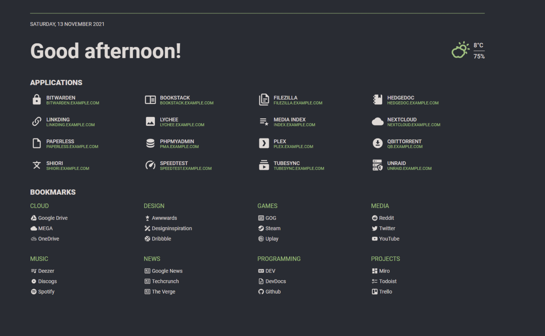 - Personalized Startpage: Flame provides a self-hosted startpage for your server, allowing you to create a personalized hub for all your applications and bookmarks. Its design, inspired by SUI, is easy to navigate and use.